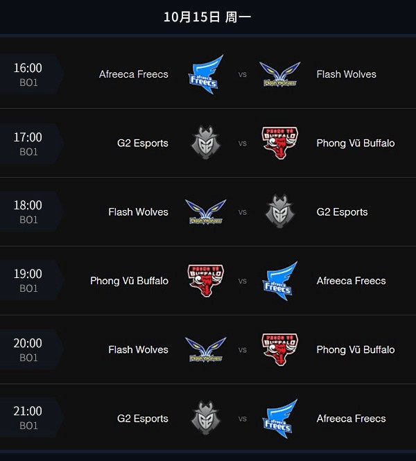 10月15日下午16:00,2018全球总决赛正赛小组赛第六天的赛事即将到来,今天的对阵情况分别为:AFsvsFW、PVBvsG2、FWvsG2、PVBvsAFs、FWvsPVB、G2vsAFs。以下为各队的首发名单: